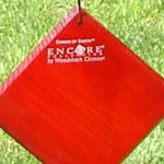 A circular hardwood top with a rich red, weather resistant finish supports 6 metal chimes of a special aluminium alloy which will not rust.  The chimes are strung on heavy duty, coated nylon line.